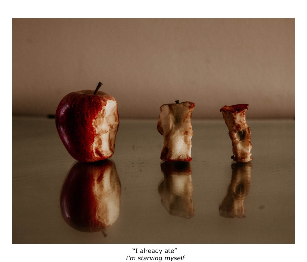 This is a huge part of my story which started at the time of my bullying and still the struggles persist. I can remember, very vividly, crying in my bed with a bucket in my lap and I was heaving into it. I kept telling my Mum and Dad that I was ill so I wouldn’t have to go to school. I stopped eating and was starving myself. My parents noticed how much weight I was losing and took me to the doctors. Still to this day I have times where I really struggle to eat. The apples symbolise my body and show the dramatic weight loss I encountered. It also shows how each day (being each apple) is different to how much I can eat. I choose an apple as they are my “go to” food when I am feeling anxious and struggling to eat.